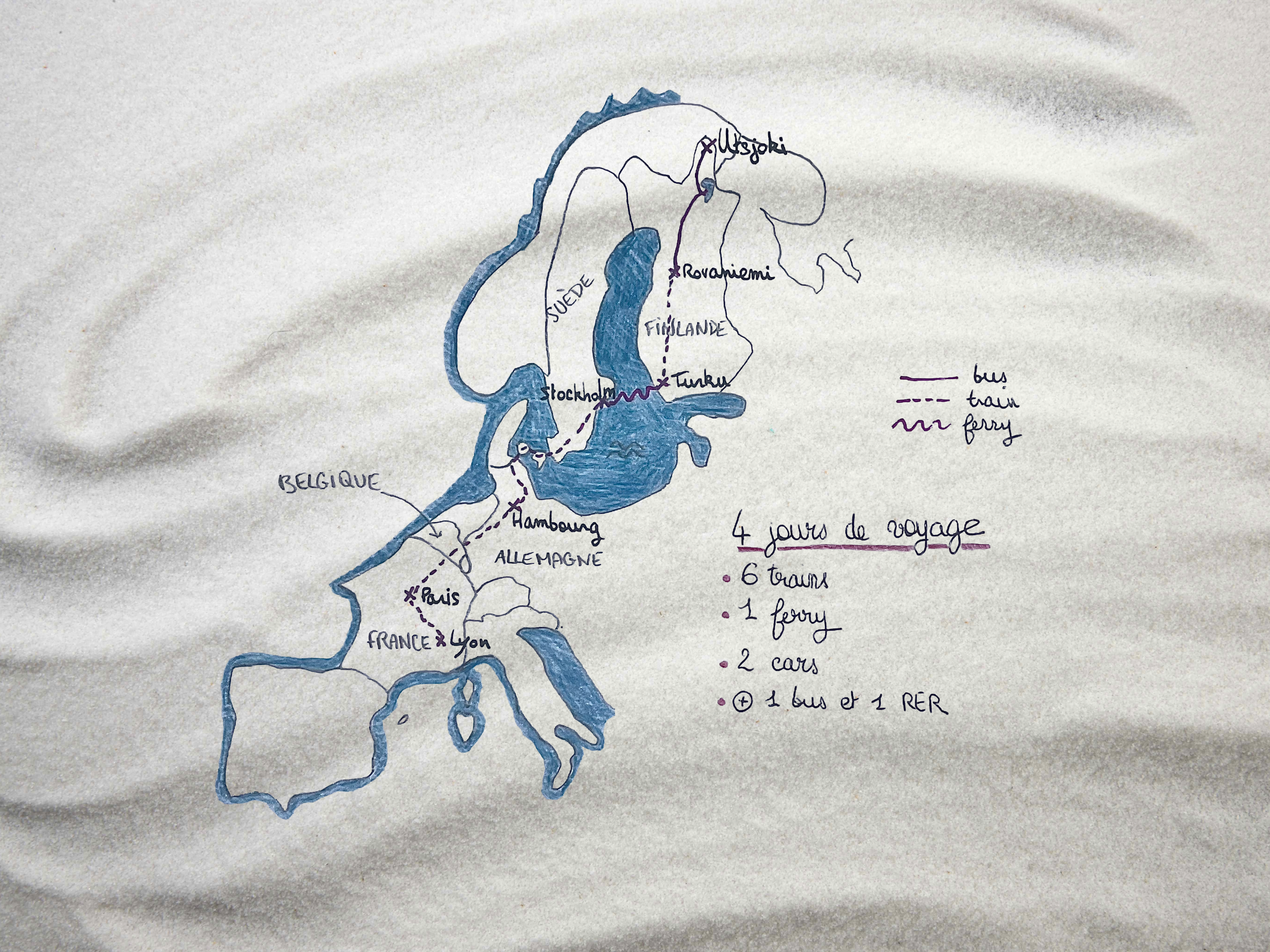 À Paris, nous prenons le RER D jusqu’à la gare du Nord. Avant de partir, j’ai fabriqué une planche à roulettes pour pouvoir tirer la pulka quand il n’y a pas de neige au sol. Le prototype est un peu fragile et pas très équilibré. Oubliant de sortir ma sangle, je pousse la pulka par l’arrière, le plus vite possible, et c’est épuisant, avec le sac à dos qui m’empêche de relever la tête pour bien voir où je vais sur les quais. Heureusement, mon père nous accompagne et Mariam, la sœur de Gabriel, Parisienne, nous a rejoints pour effectuer le changement de gare et nous ravitailler en brioches. Nous arrivons enfin sur le quai de notre Eurostar, devant la bonne voiture. Quel soulagement ! Je suis trempée, sous adrénaline. Nous nous félicitons d’avoir réussi cette jonction incertaine et nous disons au revoir avec émotion.